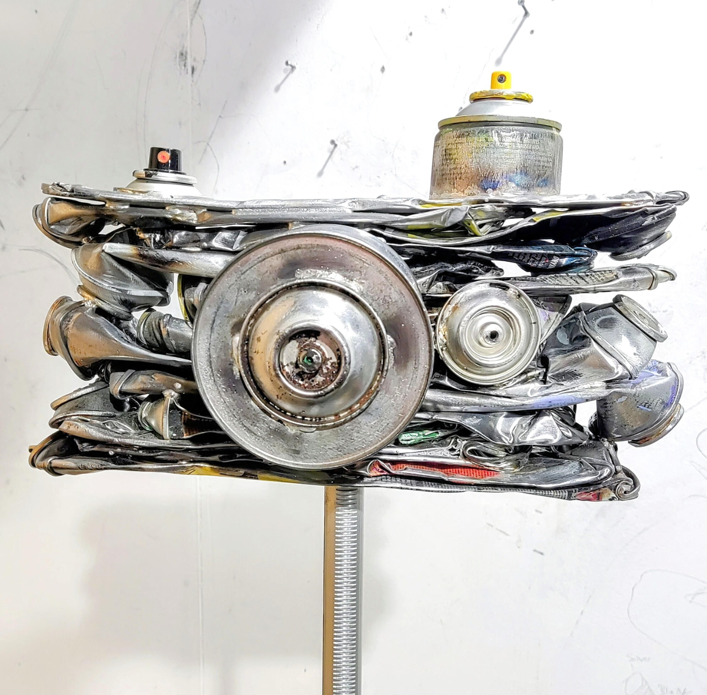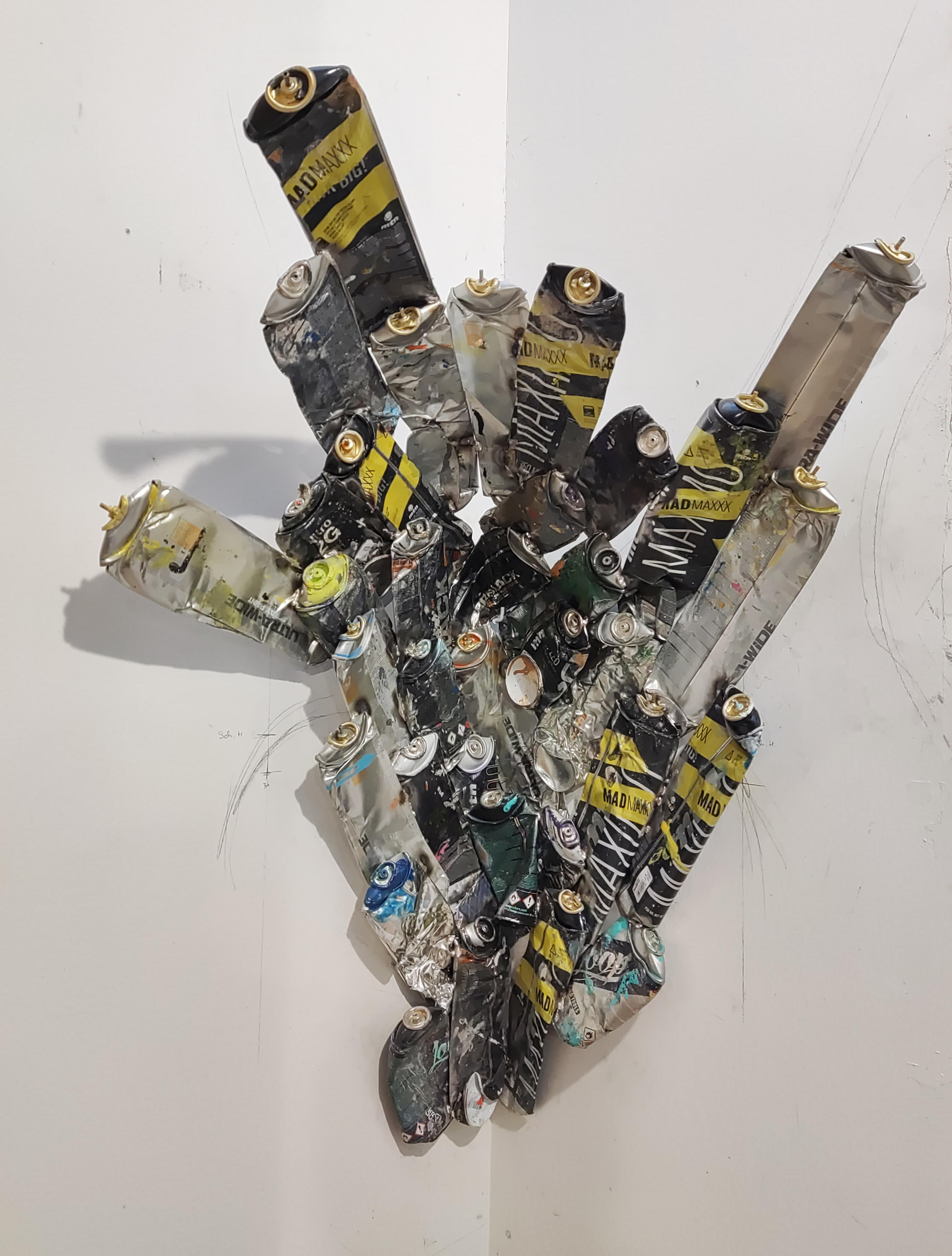 Spraycan Sculptures is the artistic practice of Munich based artist Marco Ziegletti.Used spraycans from the artist’s own graffiti practice are transformed into industrial sculptures exploring pressure, transformation and the legacy of urban culture.The ongoing series "Under Pressure" reflects the tension between destruction and creation, turning discarded objects into powerful sculptural forms.